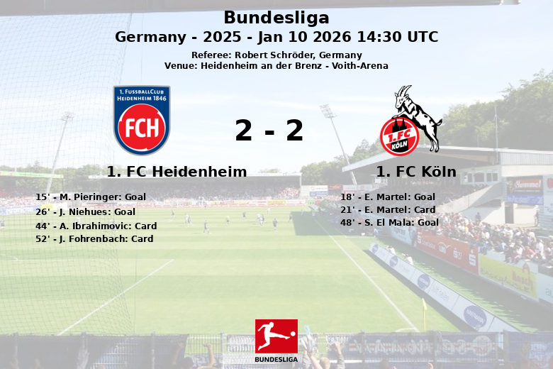 A pesar del dominio en la posesión del Heidenheim, el Köln demostró ser más efectivo en sus ataques, con 21 tiros totales frente a los 14 de su rival. El encuentro estuvo marcado por la intensidad en el mediocampo, con 9 faltas cometidas por el Heidenheim y 6 por el Köln. Además, hubo tres tarjetas amarillas mostradas, dos para jugadores del Heidenheim (A. Ibrahimovic y J. Fohrenbach) y una para Martel del Köln.