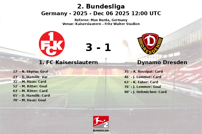El partido se intensificó en la segunda mitad. M. Ritter amplió la ventaja para el Kaiserslautern en el minuto 52, y M. Haas consolidó la victoria en el minuto 70. El Dynamo Dresden, con un 59% de posesión, luchó por meterse en el partido y J. Lemmer consiguió descontar en el minuto 76, con asistencia de L. Boeder. Sin embargo, no fue suficiente para evitar la derrota. El encuentro estuvo marcado por un total de seis tarjetas amarillas, tres para cada equipo. Kaiserslautern realizó 12 tiros en total, de los cuales 3 fueron a puerta, mientras que Dynamo Dresden intentó 8 tiros, con 2 a puerta.