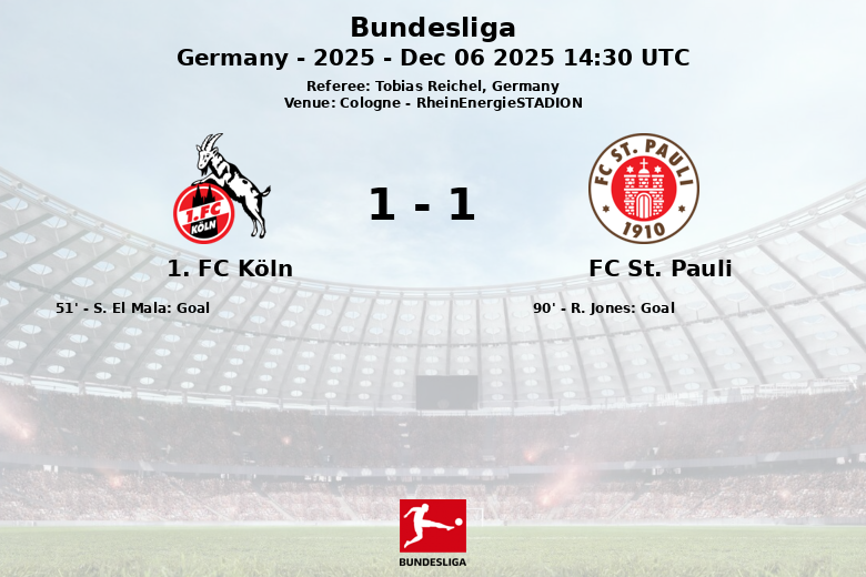 El primer gol del partido llegó en el minuto 51, cuando S. El Mala del 1. FC Köln, asistido por L. Waldschmidt, logró batir al portero rival. Parecía que el Köln se encaminaba hacia la victoria, pero el FC St. Pauli no se rindió y en el minuto 90, R. Jones anotó un gol crucial que significó el empate final. El partido terminó con 4 tiros para el St. Pauli (ninguno a puerta) y 8 para el Köln (6 a puerta). Ambos equipos cometieron 6 faltas y recibieron cero tarjetas amarillas y rojas. El resultado final refleja la paridad del encuentro y el esfuerzo de ambos equipos por llevarse los tres puntos.