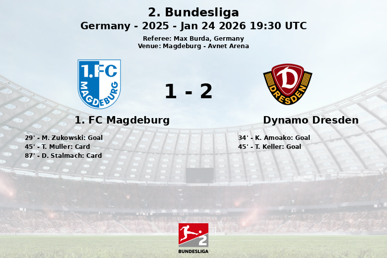 El partido comenzó con un gol tempranero de M. Zukowski para el Magdeburg al minuto 29, gracias a una asistencia de B. Atik. Sin embargo, la alegría local duró poco, ya que K. Amoako empató el partido para el Dynamo Dresden al minuto 34. Justo antes del descanso, T. Keller puso en ventaja al Dynamo Dresden al minuto 45. La intensidad del juego se reflejó también en las tarjetas, con T. Muller del Magdeburg amonestado al minuto 45 y D. Stalmach al minuto 87.