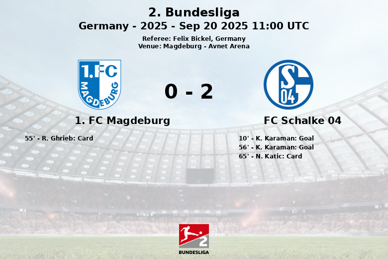 En la segunda mitad, Karaman volvió a ser protagonista al convertir un penalti en el minuto 56, ampliando la ventaja para el Schalke. El encuentro se vio interrumpido por varias faltas (14 del Schalke y 13 del Magdeburg) y tarjetas amarillas para ambos equipos (R. Ghrieb del Magdeburg y N. Katic del Schalke). Finalmente, el Schalke 04 se llevó los tres puntos en un partido donde la efectividad marcó la diferencia. El arbitraje estuvo a cargo de Felix Bickel.