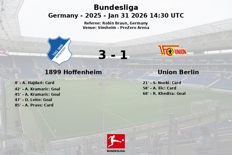 Sinsheim fue testigo de un vibrante encuentro de la Bundesliga donde el 1899 Hoffenheim se impuso al Union Berlin. El partido, disputado en el PreZero Arena bajo el arbitraje de Robin Braun, se caracterizó por una alta posesión del Hoffenheim (60%) y un mayor número de tiros por parte del Union Berlin (16).