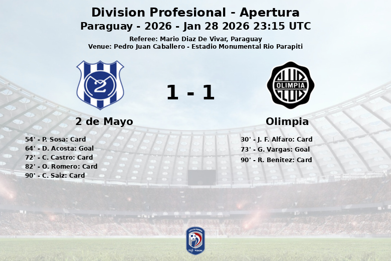 A pesar de la superioridad en la posesión y en los tiros a puerta (8 contra 4), Olimpia no logró concretar su dominio en la primera parte. El equipo local, 2 de Mayo, se adelantó en el marcador en el minuto 64 con un gol de D. Acosta, asistido por A. Gomez.