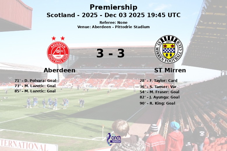 El St. Mirren abrió el marcador en el minuto 54 a través de un penal convertido por M. Fraser, tras una primera mitad donde un gol de S. Tanser fue anulado por una falta señalada por el VAR en el minuto 36. El partido tomó un giro dramático en la segunda parte. Aberdeen respondió con fuerza, primero con un gol de D. Polvara en el minuto 71, seguido rápidamente por otro de M. Lazetic en el minuto 73. Lazetic volvería a anotar en el minuto 85, asistido por S. Armstrong, consolidando la ventaja local.