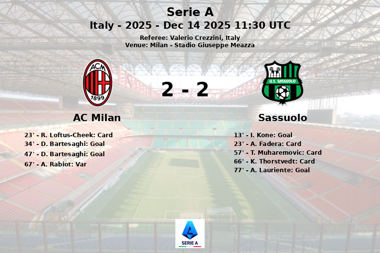 En la segunda mitad, el Milan tomó la delantera rápidamente al minuto 47 con otro gol de Bartesaghi, esta vez asistido por C. Nkunku. Sin embargo, la alegría duró poco, ya que A. Lauriente del Sassuolo igualó el marcador al minuto 77, asistido nuevamente por Pinamonti. Un gol de A. Rabiot para el Milan fue anulado por el VAR debido a un fuera de juego en el minuto 67.