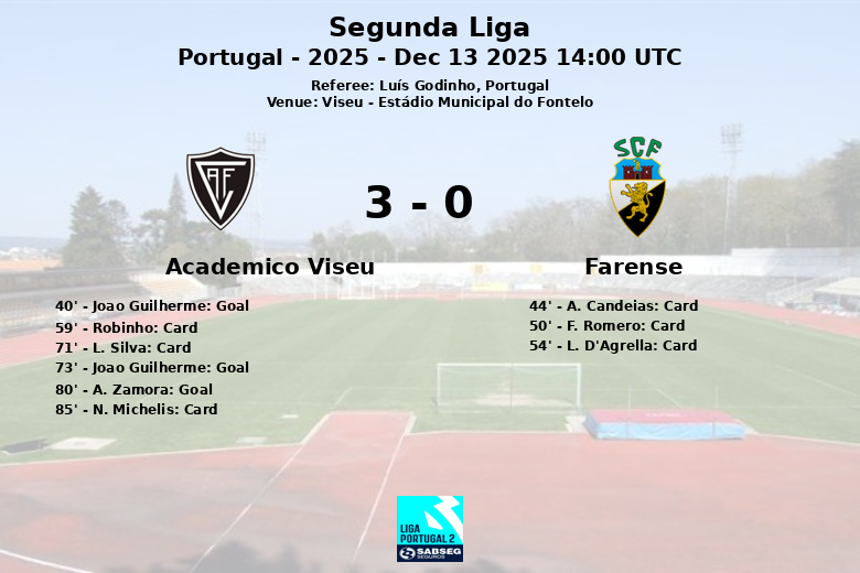 Joao Guilherme se erigió como la figura clave del partido al anotar dos goles, el primero al minuto 40 con asistencia de C. Kahraman y el segundo al minuto 73. A. Zamora selló la victoria del Académico Viseu con un tanto en el minuto 80.