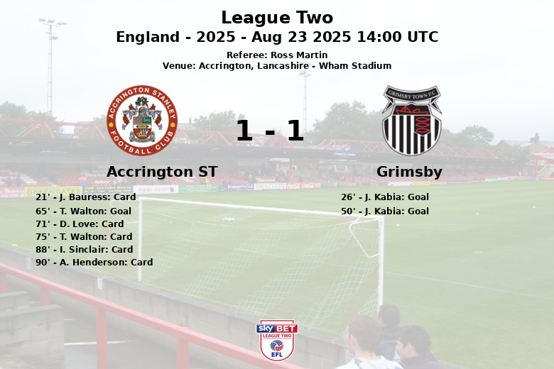 Grimsby se adelantó en el minuto 26 gracias a un gol de J. Kabia, tras una asistencia de R. Staunton. Sin embargo, Accrington Stanley no se rindió y buscó el empate con ahínco. El equipo local encontró la recompensa a su esfuerzo en el minuto 65, cuando T. Walton marcó, asistido por A. Henderson, estableciendo la igualdad en el marcador.