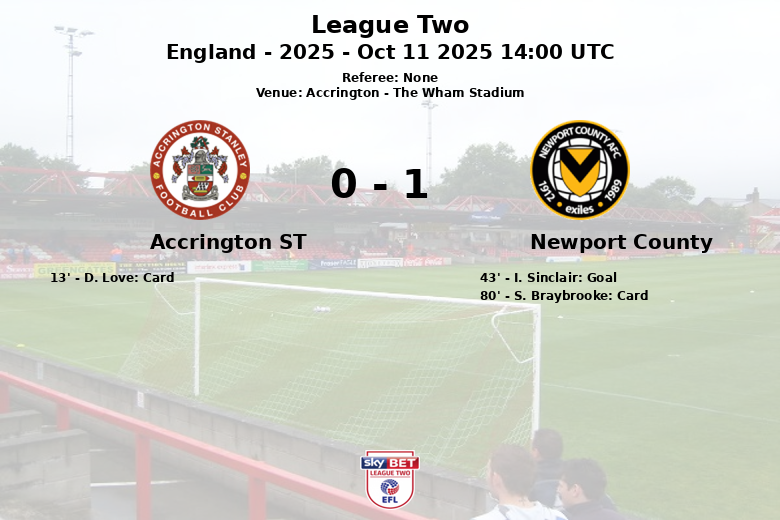 El partido se mantuvo sin goles hasta el minuto 43, cuando un desafortunado autogol de I. Sinclair, tras una jugada sin asistencia aparente, adelantó a Newport County. D. Love de Accrington ST recibió una tarjeta amarilla al minuto 13, anticipando un duelo físico.