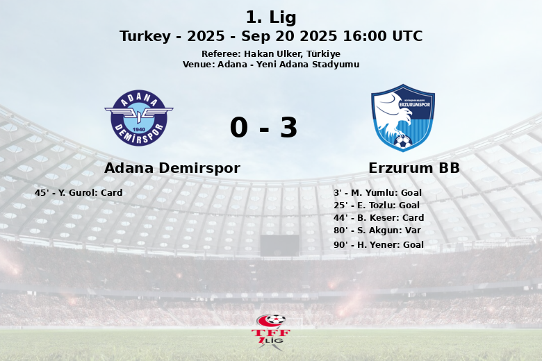 A pesar del esfuerzo del Adana Demirspor, que mantuvo un 32% de posesión y buscó oportunidades con 8 tiros, la defensa de Erzurum BB se mantuvo sólida. El partido se vio interrumpido por dos tarjetas amarillas, una para B. Keser del Erzurum BB al minuto 44 y otra para Y. Gurol del Adana Demirspor al minuto 45.