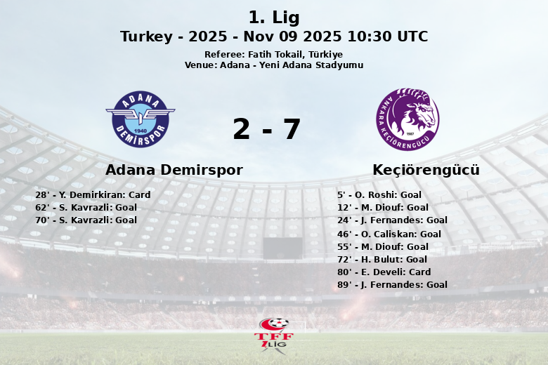 El Adana Demirspor intentó reaccionar, con dos goles de S. Kavrazli a los minutos 62 y 70, pero la defensa del Keçiörengücü se mantuvo firme y el equipo visitante continuó atacando. H. Bulut anotó al minuto 72, con asistencia de I. Akdag, y J. Fernandes selló la victoria con otro gol al minuto 89, asistido por A. Akman.