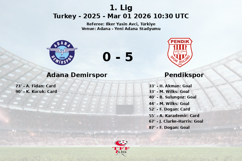 En la segunda mitad, Pendikspor continuó dominando, con J. Clarke-Harris anotando al minuto 67 y F. Dogan sellando la victoria al minuto 87. Adana Demirspor sufrió la expulsión de A. Fidan al minuto 73, complicando aún más sus opciones. El partido se caracterizó por un juego físico, con 18 faltas cometidas por Pendikspor y 11 por Adana Demirspor. Además de la tarjeta roja para Adana Demirspor, se mostraron dos amarillas para Pendikspor y una para el equipo local. Pendikspor, con una mayor precisión en sus disparos (13 a puerta), capitalizó su superioridad en el campo.