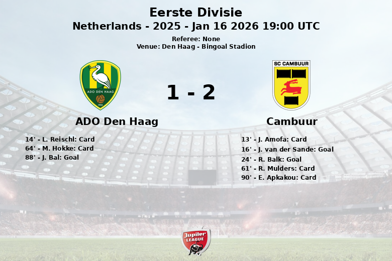 El Cambuur abrió el marcador temprano con un gol de J. van der Sande en el minuto 16, asistido por M. Diemers. Poco después, en el minuto 24, R. Balk amplió la ventaja para el Cambuur con una asistencia de J. van der Sande. El ADO Den Haag mostró una mayor agresividad en el juego, lo que se reflejó en las tarjetas amarillas recibidas por L. Reischl y M. Hokke, mientras que el Cambuur también vio tarjetas amarillas para J. Amofa, R. Mulders y E. Apkakou.