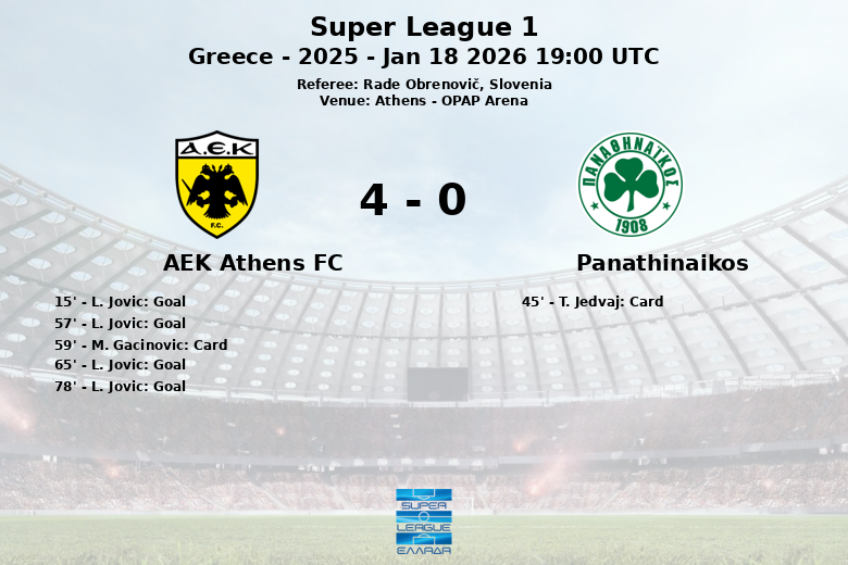Atenas, Grecia – En un partido disputado en el OPAP Arena, el AEK Atenas FC se impuso con contundencia al Panathinaikos en un encuentro correspondiente a la jornada 17 de la Super League 1. El delantero L. Jovic fue la figura destacada del partido, anotando cuatro goles que sellaron la victoria para su equipo.