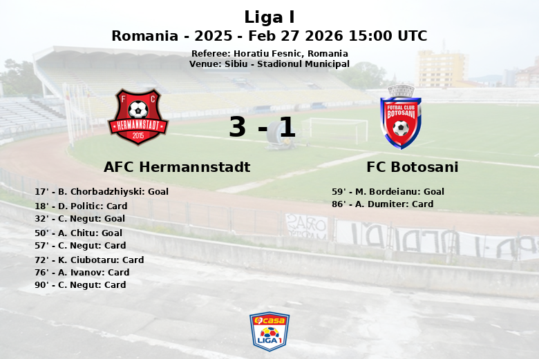 Sibiu, Rumania – El AFC Hermannstadt se impuso al FC Botosani en un vibrante encuentro disputado en el Stadionul Municipal. El equipo local, con un 45% de posesión, mostró una gran efectividad de cara al gol. B. Chorbadzhiiski abrió el marcador en el minuto 17, asistido por A. Chitu, quien más tarde, al minuto 50, también anotaría un gol, con asistencia de E. Florescu. C. Negut amplió la ventaja en el minuto 32, aunque su actuación se vio empañada por una tarjeta amarilla en el minuto 57, y otra en el 90. El equipo sufrió cuatro tarjetas amarillas adicionales (D. Politic en el 18, K. Ciubotaru en el 72, y A. Ivanov en el 76).