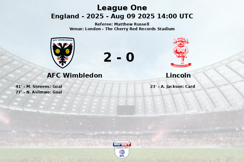 Londres, Inglaterra – En un encuentro marcado por la intensidad y las incidencias, el AFC Wimbledon se impuso al Lincoln City con un marcador final de 2 a 0 en The Cherry Red Records Stadium. El partido, correspondiente a la segunda jornada de la League One, estuvo condicionado desde el minuto 23 por la expulsión de un jugador del Lincoln, A. Jackson.