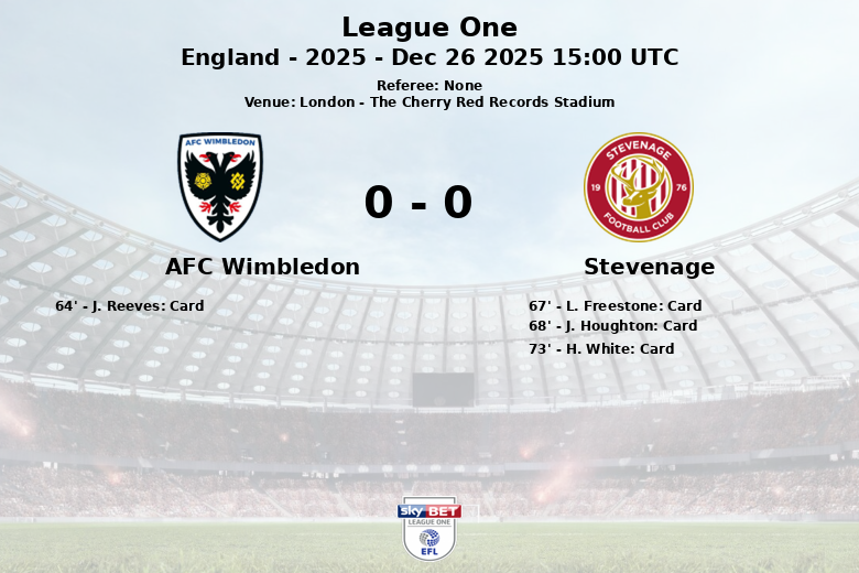 Stevenage, si bien con menor posesión (46%), logró generar más disparos (10) aunque con baja puntería, con solo uno de ellos yendo entre los tres palos. AFC Wimbledon, por su parte, realizó 5 disparos, también con solo uno a portería. La batalla en el mediocampo se reflejó en un alto número de faltas cometidas por ambos equipos (13 para Wimbledon y 11 para Stevenage) y varias tarjetas amarillas mostradas por el árbitro (1 para Wimbledon y 3 para Stevenage). Los seis corners de Stevenage superaron los dos corners de Wimbledon. El partido, válido por la temporada 2025, dejó un sabor agridulce para los aficionados de ambos equipos.