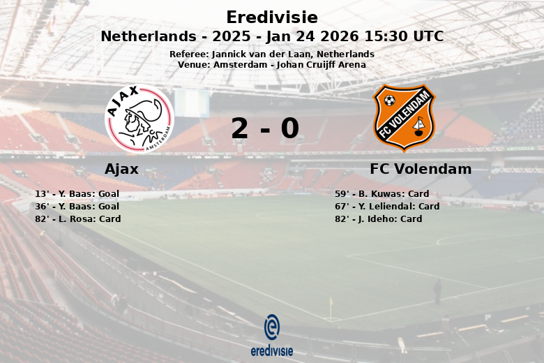 Ámsterdam, 24 de enero de 2026 – El Ajax dominó al FC Volendam en el Johan Cruijff Arena, llevándose una contundente victoria gracias a una destacada actuación de Y. Baas, quien marcó dos goles en la primera mitad.