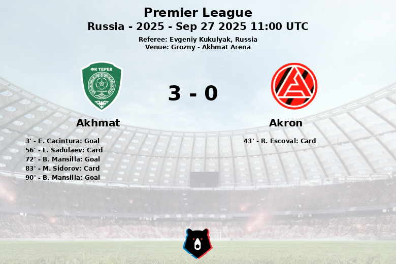 La segunda parte fue más movida, con varias tarjetas amarillas para ambos equipos (L. Sadulaev y M. Sidorov por el Akhmat, y R. Escoval por el Akron). El Akron intentó reaccionar, generando más tiros a puerta (3) que en la primera mitad, pero sin lograr concretar. El Akhmat, por su parte, amplió su ventaja al minuto 72 con un gol de B. Mansilla, asistido por M. Keliano. El mismo Mansilla selló la victoria con su segundo gol en el minuto 90, esta vez con asistencia de M. Konate, consolidando la superioridad del Akhmat en el encuentro.