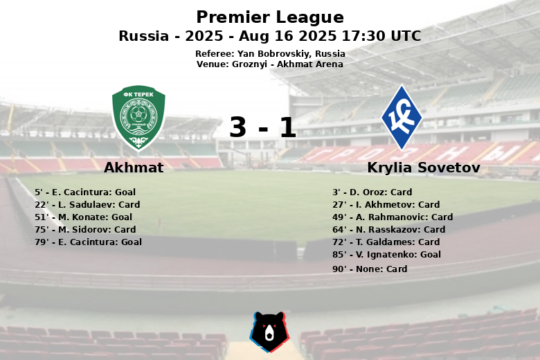 Groznyi, Rusia – El Akhmat logró una victoria contundente sobre el Krylia Sovetov en la Akhmat Arena, en un partido marcado por la intensidad y las numerosas amonestaciones. El encuentro, correspondiente a la quinta jornada de la Premier League rusa, finalizó con un marcador de 3 a 1 a favor del equipo local.