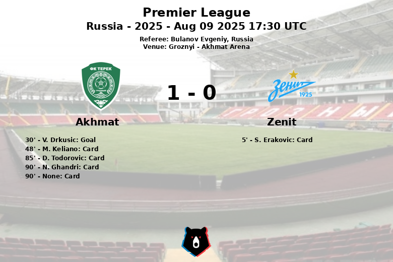 El primer tiempo estuvo marcado por un ritmo frenético, con una tarjeta amarilla temprana para S. Erakovic del Zenit al minuto 5. El momento clave de la primera mitad llegó al minuto 30, cuando un autogol de V. Drkusic, tras una desafortunada jugada, adelantó al Akhmat en el marcador.