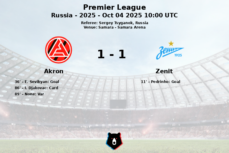 Samara, Rusia – En un encuentro disputado en el Samara Arena, Akron y Zenit empataron a uno en un partido correspondiente a la jornada 11 de la Premier League rusa. El Zenit tomó la delantera temprano con un gol de Pedrinho en el minuto 11, tras una precisa asistencia de Wendel. El equipo visitante dominó la posesión con un 66%, intentando imponer su juego sobre el terreno. Sin embargo, el Akron no se rindió y encontró el empate en el minuto 36 gracias a un tanto de E. Sevikyan, asistido por R. Fernandez.