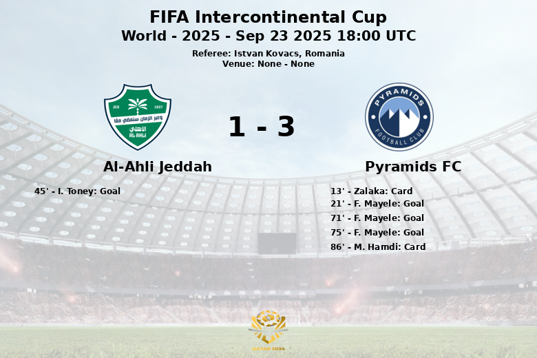En un partido disputado el 23 de septiembre de 2025, correspondiente a la segunda ronda de la FIFA Intercontinental Cup, Pyramids FC logró una valiosa victoria sobre Al-Ahli Jeddah con un marcador final de 3 a 1. El encuentro, arbitrado por el rumano Istvan Kovacs, se caracterizó por su intensidad y ritmo constante.