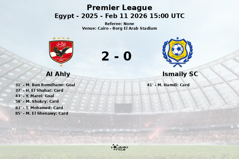 El Al Ahly se impuso al Ismaily SC en un partido disputado en el Borg El Arab Stadium de El Cairo, correspondiente a la jornada 14 de la Premier League egipcia. El encuentro, jugado el 11 de febrero de 2026, vio al Al Ahly dominar la posesión con un 70% frente al 30% del Ismaily SC.