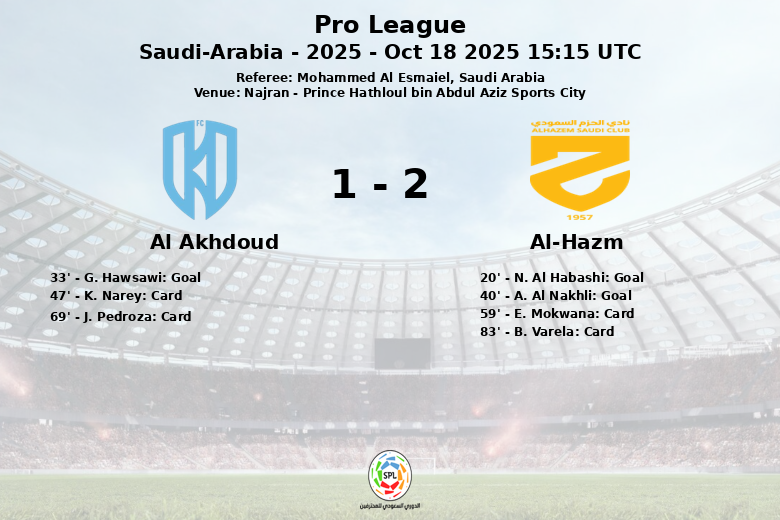 En un encuentro disputado en la ciudad de Najran, Al Akhdoud y Al-Hazm firmaron un empate que dejó un sabor agridulce a ambos equipos. El partido, correspondiente a la quinta jornada de la Pro League saudí, se jugó en el Prince Hathloul bin Abdul Aziz Sports City, bajo el arbitraje de Mohammed Al Esmaiel.