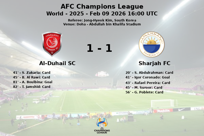 El Sharjah FC se adelantó en el marcador en el minuto 41 gracias a un penal convertido por Igor Coronado, resultado de una falta previa que también le costó una tarjeta amarilla a S. Zakaria del Al-Duhail. El encuentro se caracterizó por un juego físico, reflejado en las múltiples tarjetas amarillas mostradas a jugadores de ambos equipos: S. Abdulrahman, Rafael Pereira y M. Suroor del Sharjah FC, y B. Al Rawi del Al-Duhail, todas antes del descanso. La segunda mitad continuó con la misma tónica, con G. Poblete del Sharjah FC y T. Jamshid del Al-Duhail uniéndose a la lista de amonestados.