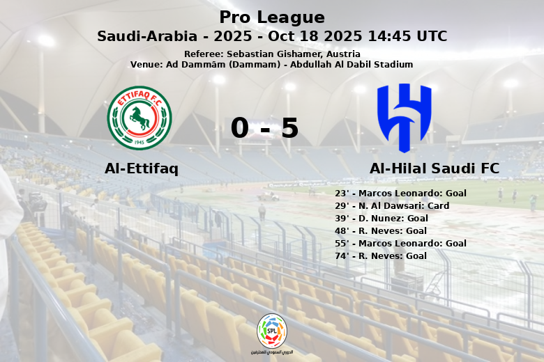 Ad Dammām (Dammam) – En un encuentro disputado en el Abdullah Al Dabil Stadium, Al-Hilal Saudi FC demostró su poderío ofensivo al vencer contundentemente a Al-Ettifaq. El árbitro Sebastian Gishamer, de Austria, fue testigo de un partido donde Al-Hilal impuso su ritmo desde el principio.