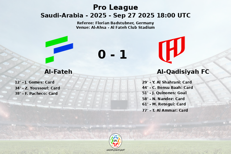 Al-Qadisiyah FC derrotó a Al-Fateh en un partido disputado en Al-Ahsa, correspondiente a la jornada 4 de la Pro League saudí. El encuentro, arbitrado por el alemán Florian Badstubner en el Al Fateh Club Stadium, se caracterizó por la alta tensión y el dominio del balón por parte del Al-Qadisiyah FC, quienes gozaron de un 65% de la posesión frente al 35% de Al-Fateh.