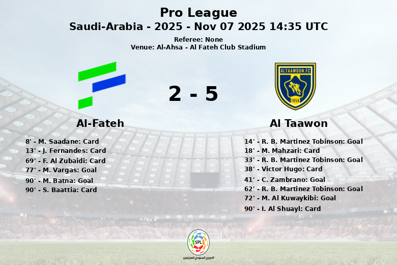 R. B. Martinez Tobinson se erigió como la figura del partido, anotando un *hat-trick* que cimentó la victoria de su equipo. La ofensiva de Al Taawon fue implacable, con goles adicionales de C. Zambrano y M. Al Kuwaykibi. A pesar de los esfuerzos de Al-Fateh, que logró descontar con goles de M. Vargas y M. Batna (de penal), la solidez del ataque rival resultó inabordable.