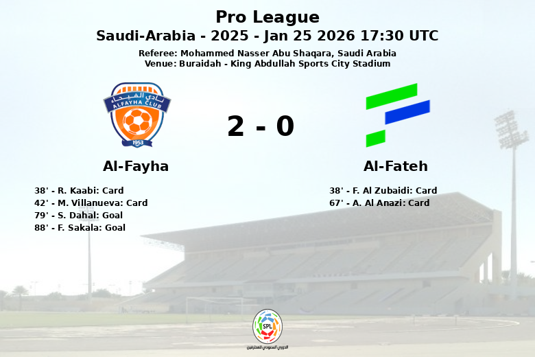 El primer gol llegó en el minuto 79, obra de S. Dahal para Al-Fayha, con asistencia de Jason Remeseiro. Al-Fayha, que dominó la posesión con un 55%, selló la victoria con un tanto de F. Sakala en el minuto 88, asistido por Y. Benzia. El marcador final reflejó la superioridad de Al-Fayha en la definición. El encuentro se caracterizó por el juego físico, evidenciado por las 12 faltas cometidas por Al-Fateh y las 8 de Al-Fayha, que resultó en un total de cuatro tarjetas amarillas mostradas durante el partido, dos para cada equipo. Al-Fayha logró capitalizar sus oportunidades de gol, asegurando los tres puntos en un encuentro competido.