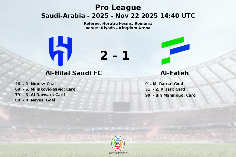 Riyadh, Arabia Saudita – En un encuentro disputado en el Kingdom Arena, el Al-Hilal Saudi FC se impuso a Al-Fateh en un partido que mantuvo a los aficionados al borde de sus asientos. El partido, correspondiente a la novena jornada de la Pro League, estuvo marcado por la intensidad y las decisiones arbitrales que influyeron en el desarrollo del juego.