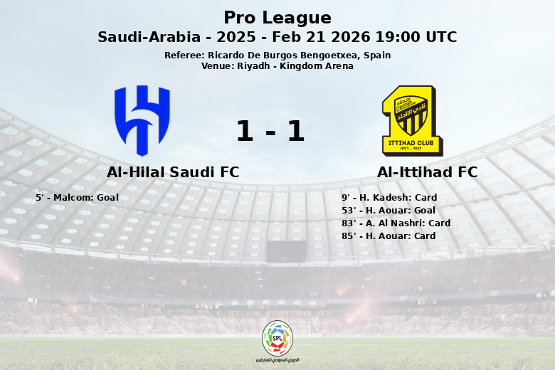 Riyadh fue testigo de un encuentro vibrante en la Pro League donde Al-Hilal Saudi FC y Al-Ittihad FC igualaron. El partido, disputado en el Kingdom Arena, estuvo marcado por la temprana expulsión de H. Kadesh para Al-Ittihad FC en el minuto 9. Al-Hilal tomó la delantera rápidamente, con un gol de Malcom en el minuto 5, asistido por S. Al Dawsari. A pesar de jugar con diez hombres durante la mayor parte del encuentro, Al-Ittihad mostró garra y logró empatar en el minuto 53 gracias a un gol de H. Aouar, con asistencia de M. Al Shanqiti.