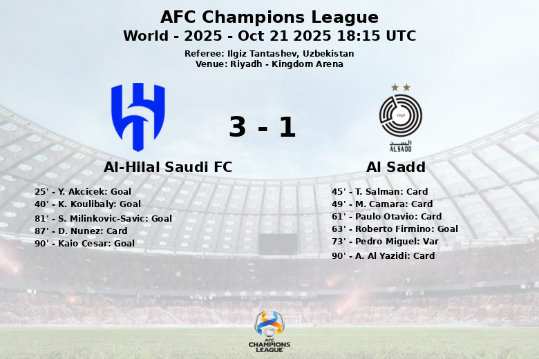 El partido estuvo marcado por la intensidad y la disputa, evidenciada en las tarjetas amarillas mostradas a T. Salman, M. Camara, Paulo Otavio y A. Al Yazidi por parte del Al Sadd, y a D. Nunez por parte del Al-Hilal.