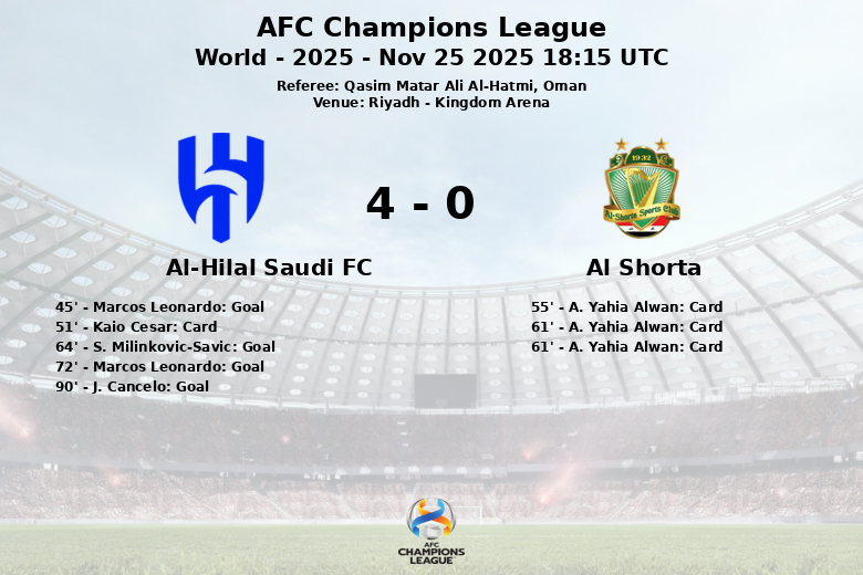 Marcos Leonardo volvió a marcar en el minuto 72, esta vez con la asistencia de N. Al Dawsari, consolidando aún más la victoria para el Al-Hilal. J. Cancelo cerró la goleada en el minuto 90, con una asistencia de M. Kanno, dejando el marcador final en un expresivo 4 a 0. El Al Shorta, con un 36% de posesión y sin disparos a puerta, luchó sin éxito contra el poderío del equipo saudí. El árbitro Qasim Matar Ali Al-Hatmi, de Omán, tuvo una labor intensa, mostrando varias tarjetas durante el encuentro.