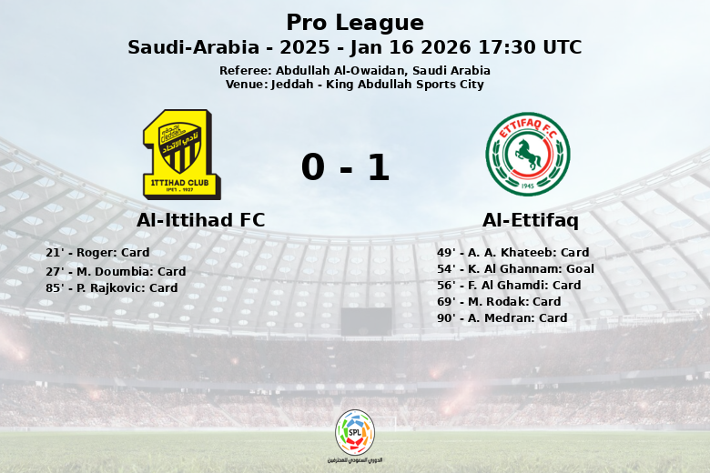 En un encuentro disputado en el King Abdullah Sports City de Jeddah, Al-Ettifaq logró una importante victoria sobre Al-Ittihad con un marcador de 1 a 0. El partido, correspondiente a la jornada 16 de la Pro League de Arabia Saudita, estuvo marcado por la intensidad y la disciplina táctica de Al-Ettifaq.