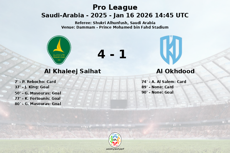 En un partido disputado en el Prince Mohamed bin Fahd Stadium de Dammam, Al Khaleej Saihat se impuso con autoridad a Al Okhdood, demostrando una clara superioridad en el juego. Desde el inicio, el equipo local controló la posesión del balón con un 62%, generando constantes oportunidades de gol.