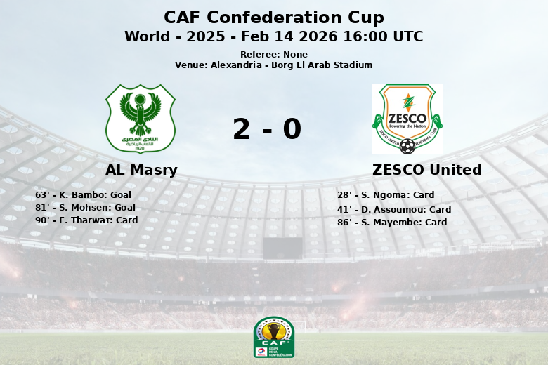 En la segunda mitad, el Al Masry abrió el marcador en el minuto 63 con un gol de K. Bambo, asistido por A. Mansour. El dominio local continuó y S. Mohsen amplió la ventaja en el minuto 81, sin asistencia. El ZESCO United intentó reaccionar, pero sus esfuerzos fueron en vano.