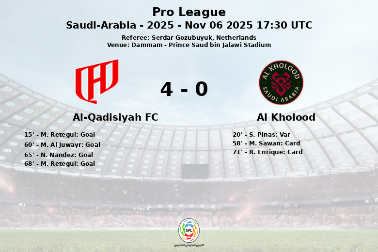 M. Retegui abrió el marcador al minuto 15 mediante un penal, dando una ventaja temprana al Al-Qadisiyah. Al Kholood intentó responder, pero un gol de S. Pinas fue anulado por el VAR al minuto 20. En la segunda mitad, Al-Qadisiyah consolidó su dominio con goles de M. Al Juwayr al minuto 60, N. Nandez al minuto 65 y nuevamente M. Retegui al minuto 68, este último con asistencia de J. Weigl.