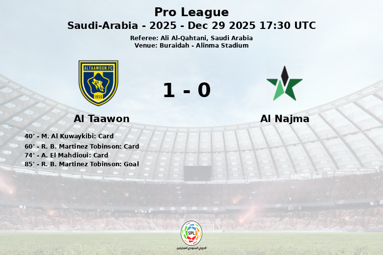 Buraidah, Arabia Saudita – En un encuentro disputado en el Alinma Stadium, Al Taawon logró una victoria trabajada sobre Al Najma en un partido correspondiente a la jornada 12 de la Pro League saudí. Bajo el arbitraje de Ali Al-Qahtani, el equipo local dominó la posesión con un 61%, aunque encontró dificultades para concretar su superioridad en el marcador.
