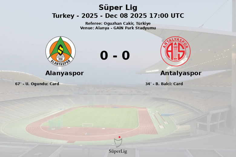 Alanya, Turquía – En un encuentro disputado en el GAİN Park Stadyumu, Alanyaspor y Antalyaspor igualaron sin goles en la decimoquinta jornada de la Süper Lig. El partido, arbitrado por Oguzhan Cakir, se caracterizó por una intensa lucha en el mediocampo y escasas ocasiones claras de gol.