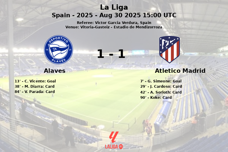Vitoria-Gasteiz fue testigo de un partido disputado y con tarjetas entre el Alavés y el Atlético Madrid en el Estadio de Mendizorroza. El encuentro, correspondiente a la tercera jornada de La Liga, finalizó con un empate tras un duelo marcado por la intensidad y la disputa en el centro del campo.