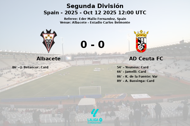 Albacete y AD Ceuta FC empataron sin goles en un encuentro disputado en el Estadio Carlos Belmonte, correspondiente a la novena jornada de la Segunda División. El partido, arbitrado por Eder Mallo Fernández, se caracterizó por la intensidad y la lucha en el mediocampo, reflejado en el elevado número de faltas cometidas por ambos equipos.
