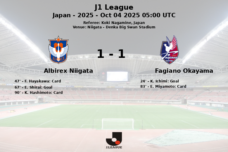 Niigata, Japón – En un encuentro disputado en el Denka Big Swan Stadium, Albirex Niigata y Fagiano Okayama empataron en un partido marcado por la intensidad y la lucha constante. Fagiano Okayama se adelantó en el minuto 24 con un gol de K. Ichimi, asistido por H. Motoyama, sorprendiendo al conjunto local.
