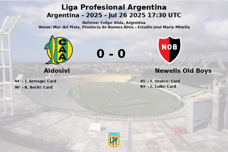 El partido también tuvo momentos de tensión, reflejados en las tarjetas amarillas. T. Serrago de Aldosivi recibió una amonestación en la primera mitad, mientras que F. Orozco y L. Lollo de Newell’s Old Boys fueron amonestados en la primera y segunda mitad respectivamente. R. Bochi del conjunto local recibió la tarjeta amarilla sobre el final del partido.