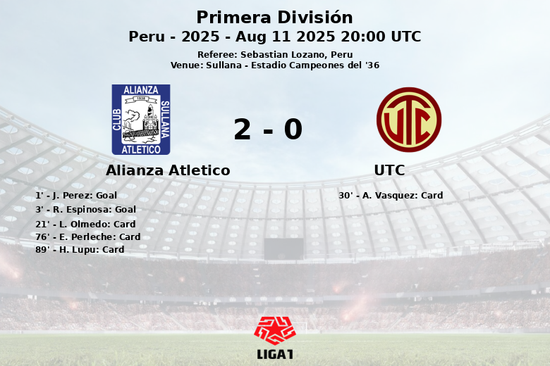 Sullana, Perú – En un encuentro disputado en el Estadio Campeones del ’36, Alianza Atlético se impuso a UTC en un partido que comenzó con un ritmo frenético y terminó con polémica. Desde el pitido inicial, los locales demostraron su superioridad, anotando dos goles en los primeros tres minutos. J. Perez abrió el marcador al minuto 1 con asistencia de L. Olmedo, seguido rápidamente por R. Espinosa al minuto 3, asistido por A. Graneros, poniendo el 2 a 0 tempranero.