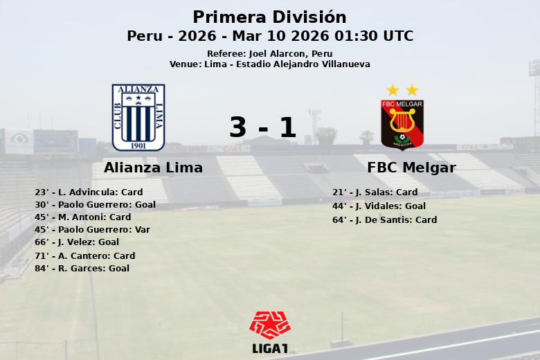 Lima, Perú – En un vibrante partido disputado en el Estadio Alejandro Villanueva, Alianza Lima logró una valiosa victoria ante FBC Melgar en la sexta jornada de la Primera División peruana. El encuentro, arbitrado por Joel Alarcón, se caracterizó por la intensidad y las ocasiones de gol en ambos arcos.