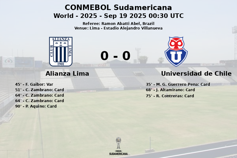 El encuentro se vio marcado por las tarjetas. Alianza Lima sufrió la expulsión de Carlos Zambrano en el minuto 64, luego de recibir su segunda amonestación. Adicionalmente, otros dos jugadores del equipo peruano, Paolo Aquino y Carlos Zambrano, fueron amonestados, sumando un total de tres tarjetas amarillas, además de la roja. Por su parte, Universidad de Chile acumuló tres tarjetas amarillas para Marcelo G. Guerrero Pena, José Altamirano y Renato Contreras. Un gol de Alianza Lima, anotado por F. Gaibor, fue anulado por el VAR por una mano. La intensidad del partido se reflejó en las faltas, con 15 cometidas por Universidad de Chile y 9 por Alianza Lima.